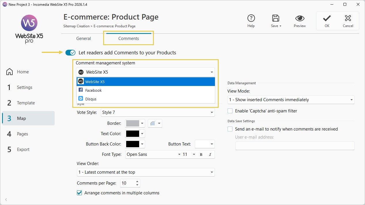 - Öffnen Sie den Bereich Kommentare und aktivieren Sie das gewünschte System: das interne System von WebSite X5, Facebook oder Disquss.