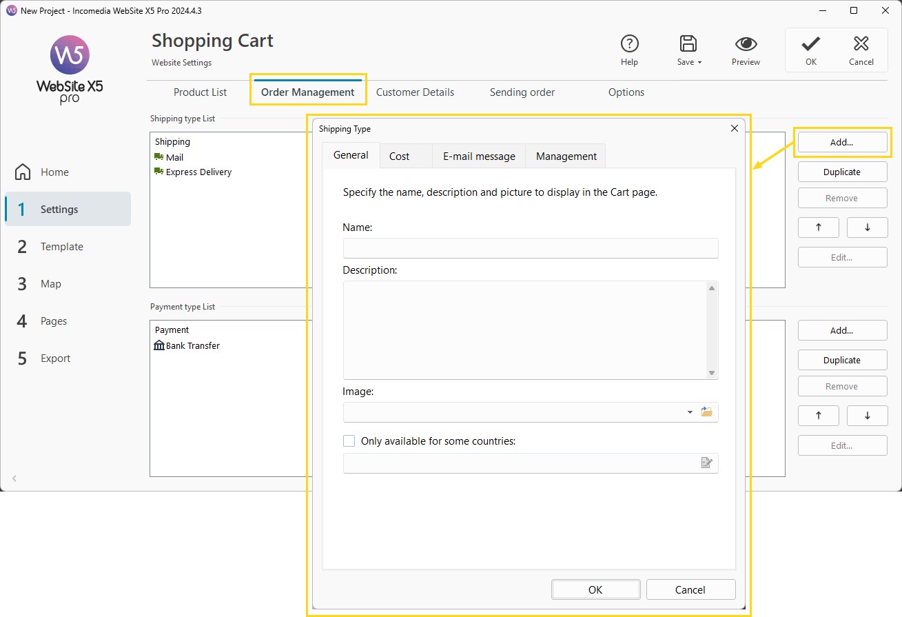 - In the Shopping Cart, Order Management window, the Shipping type List table proposes default values of "Post" and "Express Courier"