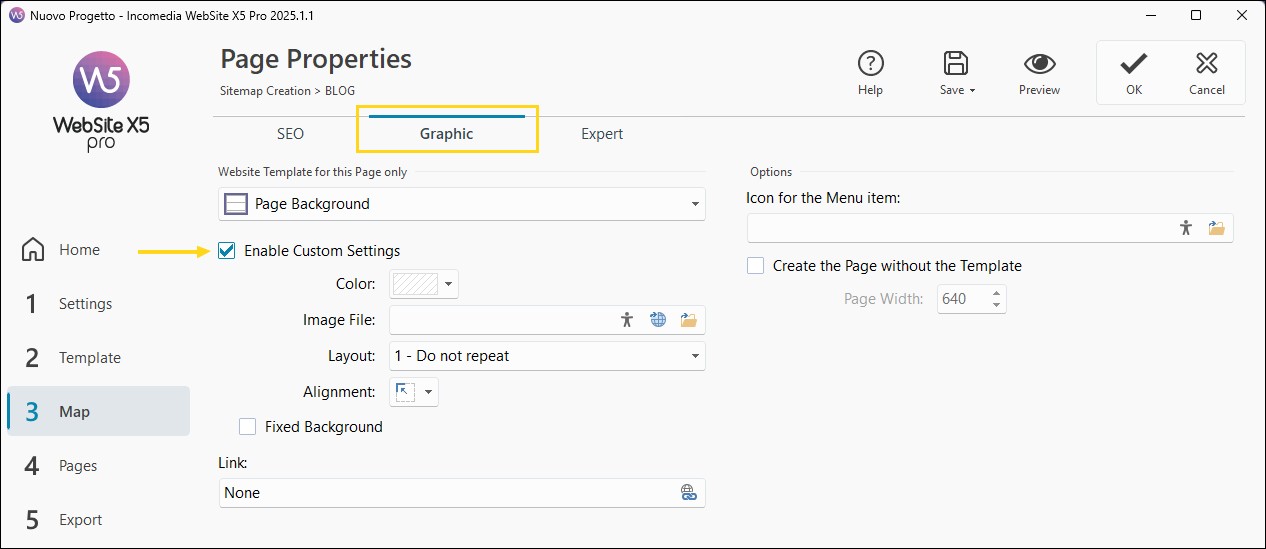 - Nella finestra Proprietà Pagina, accedi alla sezione Grafica.