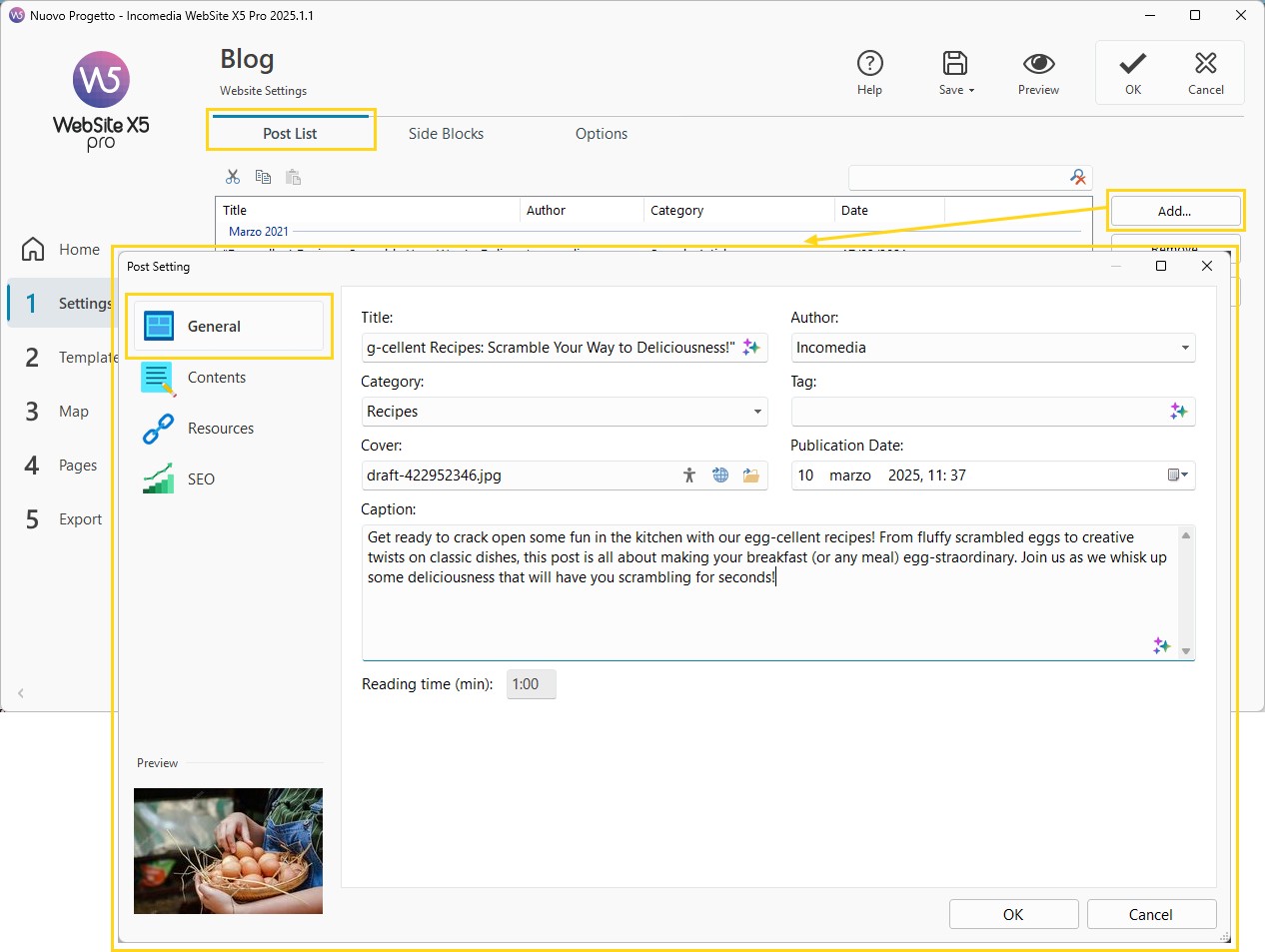- Vai in Blog > Articoli e clicca sul pulsante Aggiungi per accedere alla finestra Impostazioni Articolo: qui trovi tutti i comandi necessari per creare un post.
