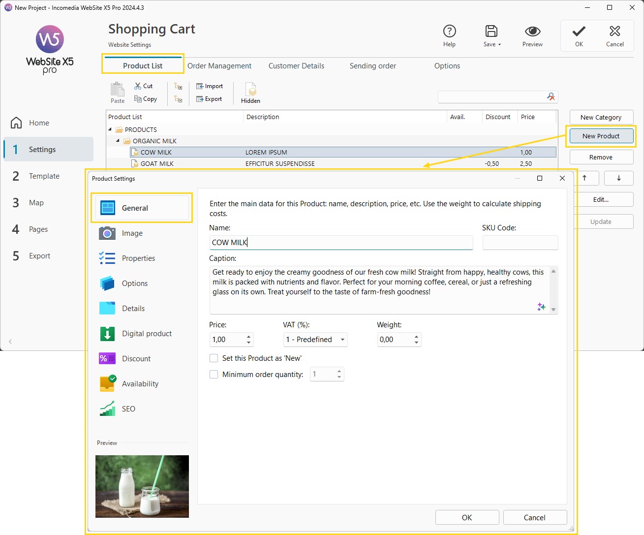 - Nella sezione Generale, inserisci il Nome del prodotto e una breve descrizione. Componi questi testi con cura: saranno ripresi per creare le card e le schede prodotto sul tuo store. Per procedere più velocemente puoi ricorrere all'aiuto di MagicText, l'assistente per la generazione di contenuti testuali basato sull'Intelligenza Artificiale integrato in WebSite X5. Clicca sui pulsante