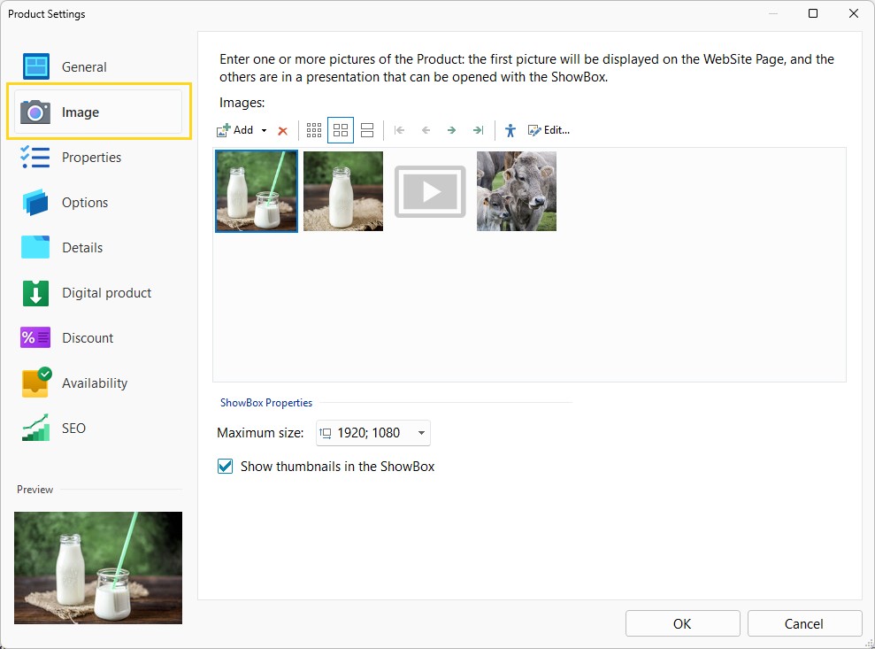 - Accedi ora alla sezione Immagine, clicca sul pulsante Aggiungi e seleziona una o più immagini del prodotto. Oltre alle immagini puoi prevedere anche dei video. La prima immagine inserita verrà visualizzata direttamente nelle card e nelle schede prodotto, le altre comporranno una presentazione aperta tramite ShowBox.