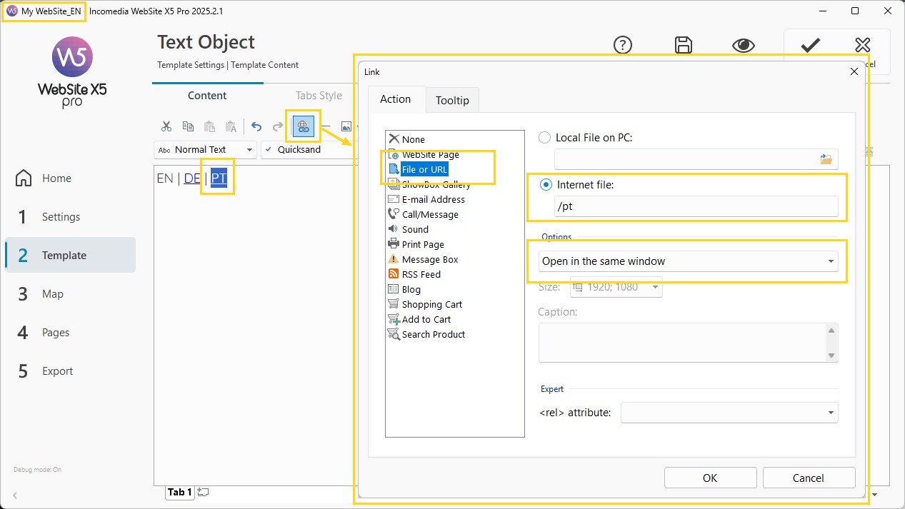 - Apri il progetto in lingua tedesca e utilizza la procedura vista per ricreare la stessa pulsantiera. Imposta i collegamenti sulle diciture EN e PT.
