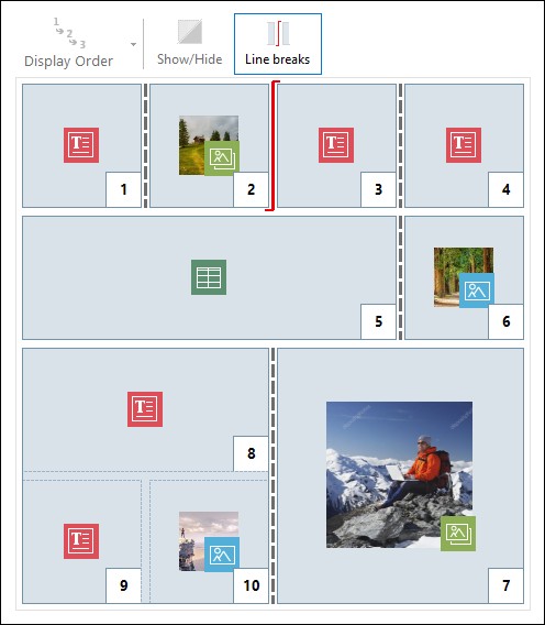 Da notare che il simbolo di Interruzione di Riga rispecchia l'ordinamento impostato. In questo modo si cerca di rendere meglio l'idea che, per esempio, l'Oggetto 7 verrà posizionato sopra il Blocco degli Oggetti 8, 9 e 10 dato che l'ordinamento degli Oggetti per quella riga va da destra verso sinistra.