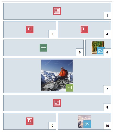 Da notare che, quando un Oggetto si dispone su più colonne, nel passaggio da un breakpoit al successivo viene mantenuta la stessa proporzione in larghezza. Nell'Immagine 1 si vede, per esempio, che al breakpoint Desktop l'Oggetto 5 occupa 3 colonne su 4 disponibili: questo significa che è largo per il 75% della riga. Questa proporzione viene mantenuta anche al breakpoint successivo (Immagine 3), anche se gli altri Oggetti allineati ad asso in larghezza non seguono più la disposizione precedente.
