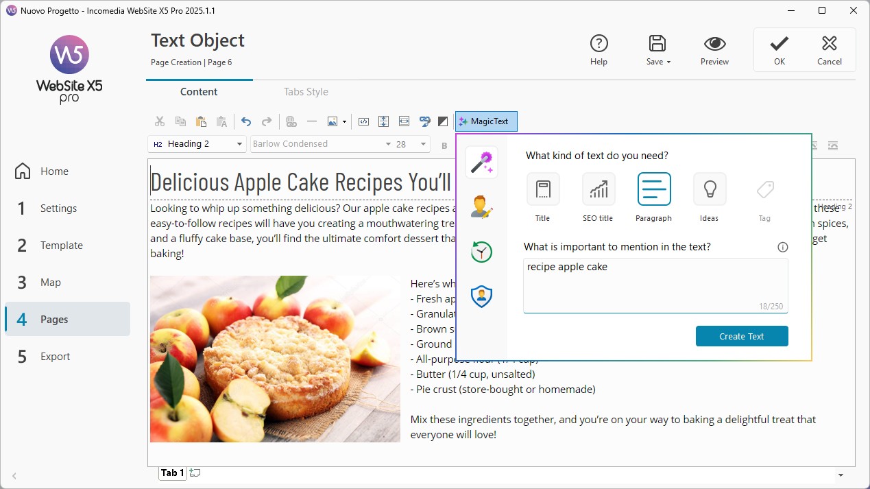 Incolla speciale: in questo caso, prima di essere incollato, al testo vengono tolte tutte le formattazioni eventualmente associate in origine e assume quelle definite nell'editor. - generare il testo con l'aiuto di MagixText, l'assistente per la scrittura di contenuti testuali basato sull'Intelligenza Artificiale integrato nelle edizioni Pro, a partire dalla versione 2023.2, e Agency di WebSite X5. Lavorare con MagicText è semplicissimo: clicca sul pulsante