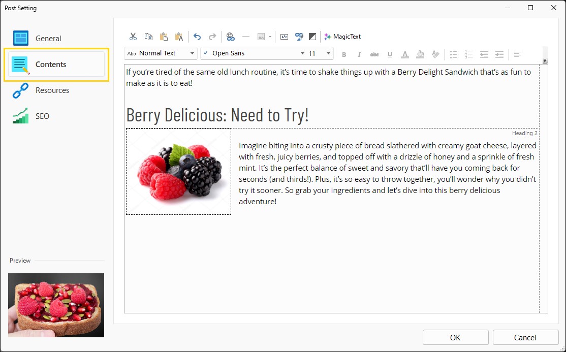 Se sei alla ricerca di un'ispirazione o hai bisogno di un aiuto nella stesura dell'articolo, fatti aiutare da MagicText, l'assistente per la generazione di testi basato sull'intelligenza artificiale e già integrato in WebSite X5 (solo nelle edizioni Pro, dalla v.2023.2, e Agency).