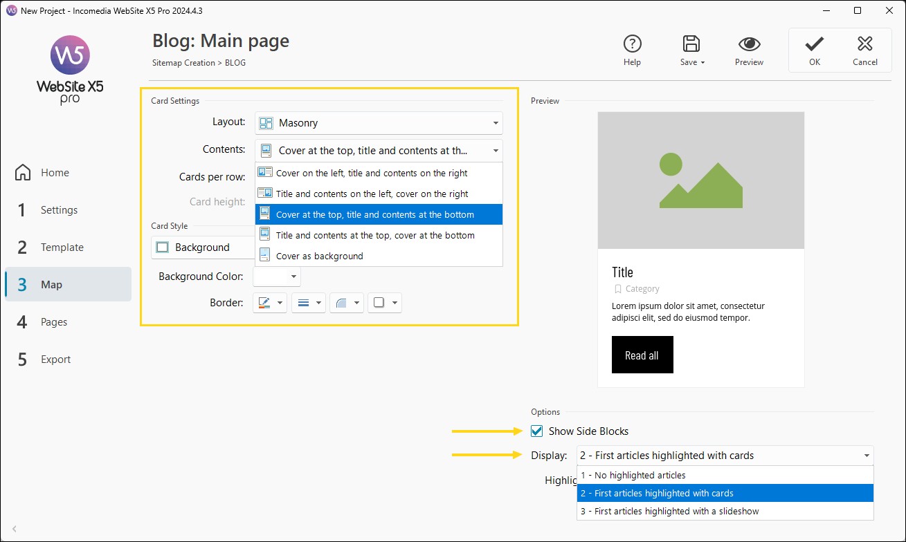 - In Impostazioni card decidi la Disposizione delle card all'interno della pagina e l'impaginazione dei Contenuti all'interno dei ogni singola card.