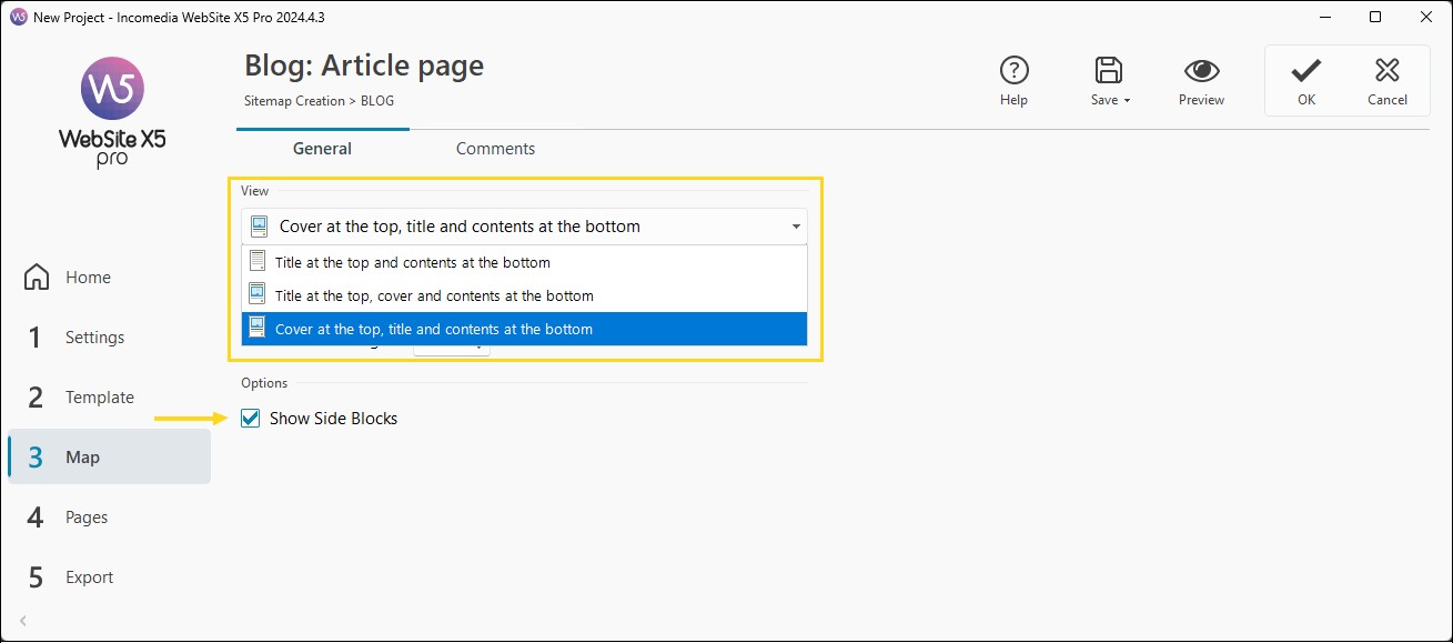 - Nella sezione Generale, usa le opzioni disponibili in Visualizzazione per scegliere come vuoi che il titolo, l'immagine di copertina e il contenuto siano disposti.
