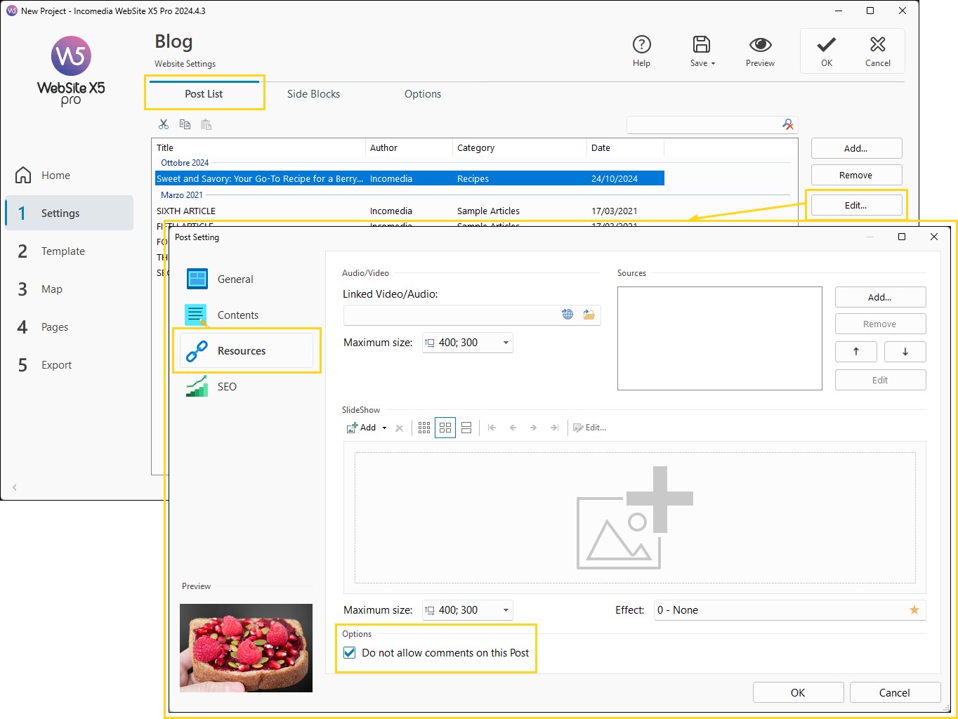 - Apri la sezione Risorse e attiva l'opzione Non abilitare i commenti per questo Articolo.