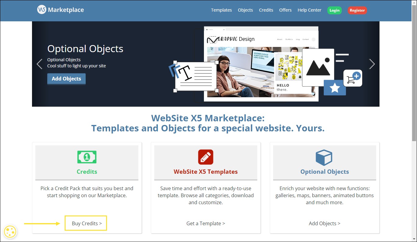 I Crediti sono la moneta in uso sul Marketplace di WebSite X5. Li puoi usare per acquistare le risorse aggiuntive a quelle incluse nel software: Oggetti Opzionali e Template.
