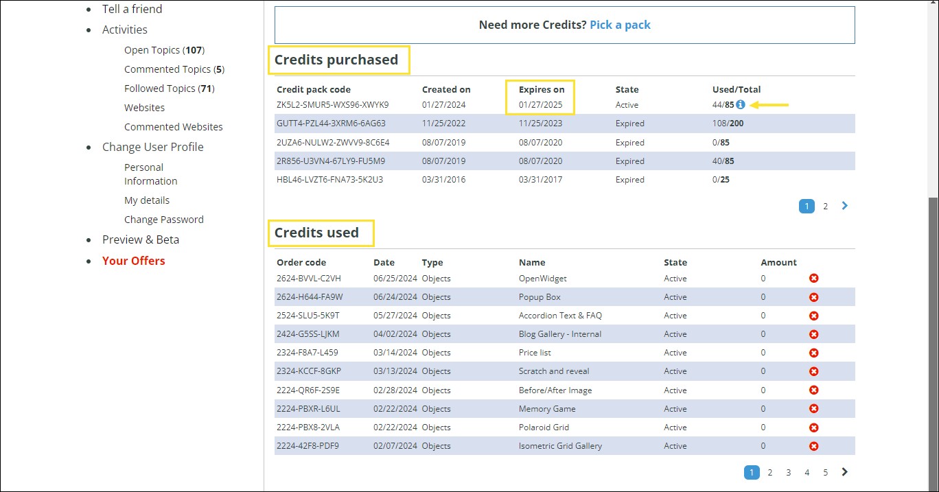 - Crediti Usati/Totale: posiziona il cursore sulla "i" per vedere quanti Crediti ti restano da utilizzare per singolo pacchetto.